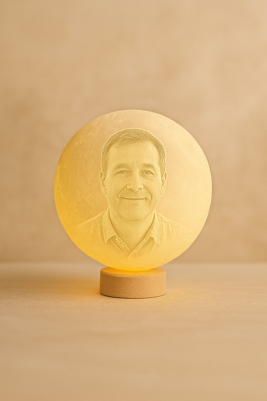 De bol heeft een diameter van 15 cm en rust op een stijlvol houten voetje. Dankzij het zachte, dimbare licht is het ideaal als nachtlampje, decoratie of een warm aandenken aan een bijzonder moment.
