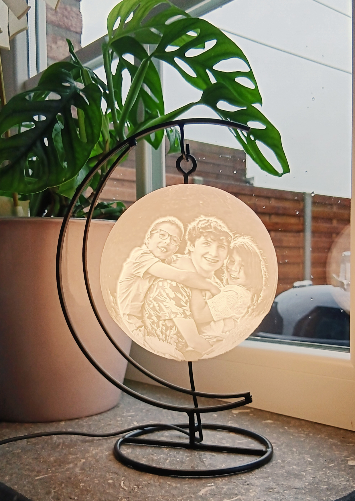 Laat jouw mooiste herinnering stralen in deze hangende moonglobe met een elegante zwarte metalen maanhanger. De maanlamp is voorzien van een persoonlijke foto en zweeft als het ware in de stijlvolle metalen houder – een echte blikvanger in elk interieur.
